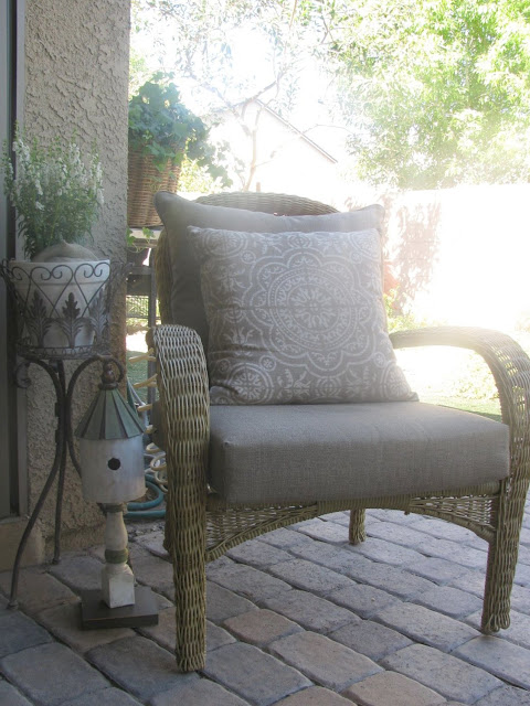 I found replacements for the old tropical print cushions. These are bark cloth cushions from Home Depot. To be honest they are a little scratchy. I love having cushions in a neutral color though so I can change the look of my patio on a whim simply by changing out the throw pillows.